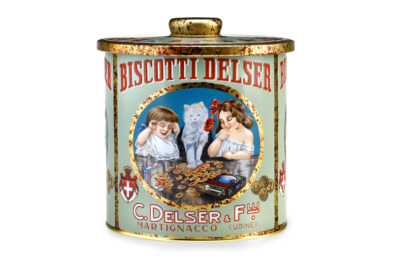 Caratteristiche sono le classiche biscottiere di latta in stile vintage con la riproduzione delle originali illustrazioni storiche o moderne.